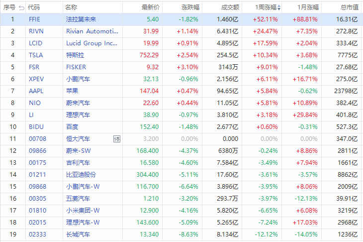 截至发稿的近一周以来,新能源造车企业股价涨跌不一 。法拉第未来近一周涨超52%位居涨幅榜第一。其他成分股中,Rivian涨超24%,Lucid涨超17%,特斯拉反弹涨超10%,“蔚小理”集体跟涨。