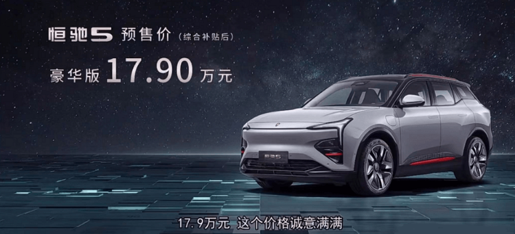 恒驰 5 于7月6日正式开启预售,预售价 17.9 万元。定位为紧凑型纯电 SUV,新车搭载宁德时代磷酸铁锂电池。恒驰表示,订金1000元,8月1日可转大定。