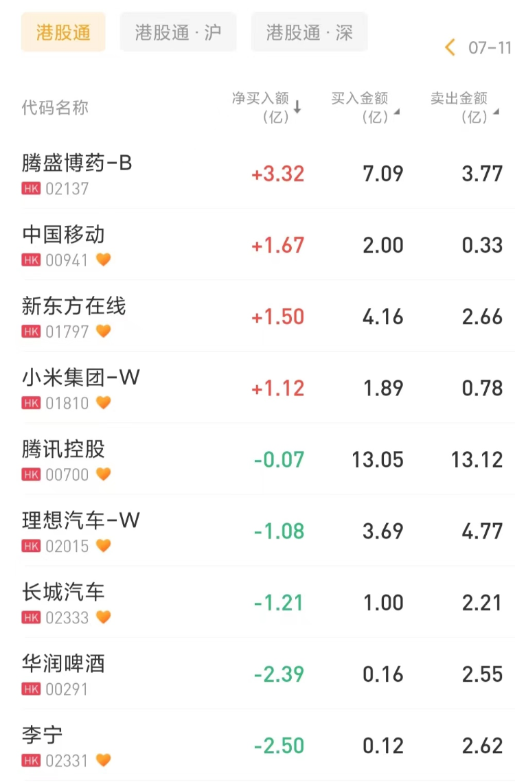 南下资金净买入腾盛博药-B3.32亿港元,为今日买入之最。北水增持中国移动1.67亿港元。此外,南下资金净买入新东方在线1.5亿港元,小米集团-W也获增持。
