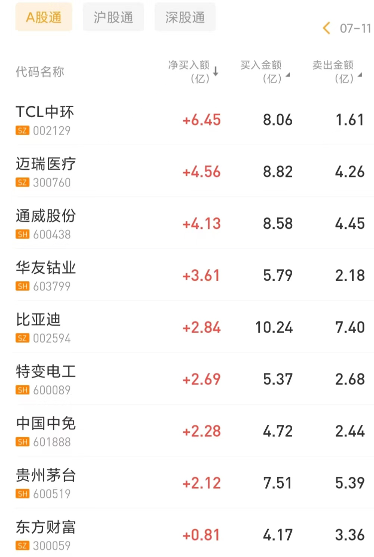 北上资金今日净买入TCL中环6.45亿元,为今日买入之最;净买入迈瑞医疗4.56亿元。