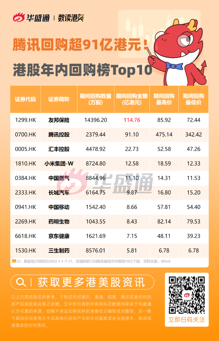其中,友邦保险以114亿港元回购金额位居榜首,腾讯控股、汇丰控股分列2、3位。小米集团-W、中国燃气开年以来的回购规模均超10亿港元级别。