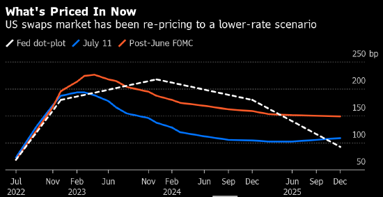 与美联储会期挂钩的掉期合约显示,官方隔夜利率2023年第一季度将在3.5%附近见顶,到年底将降息逾50个基点。