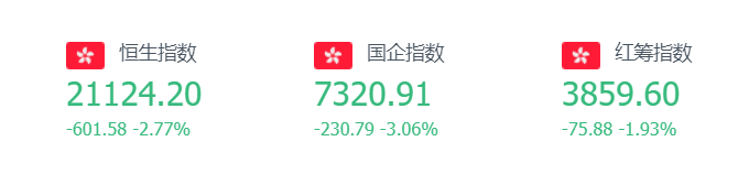 港股大幅低开后持续下挫,尾盘跌幅有所收窄,恒生指数收盘跌2.77%报21124.2点,恒生科技指数跌3.86%报4622.92点,恒生国企指数跌3.06%报7320.91点;大市成交1194.65亿港元。