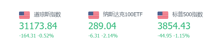 美国三大股指全线收跌,道指跌0.52%报31173.84点,标普500指数跌1.15%报3854.43点,纳指跌2.26%报11372.6点。
