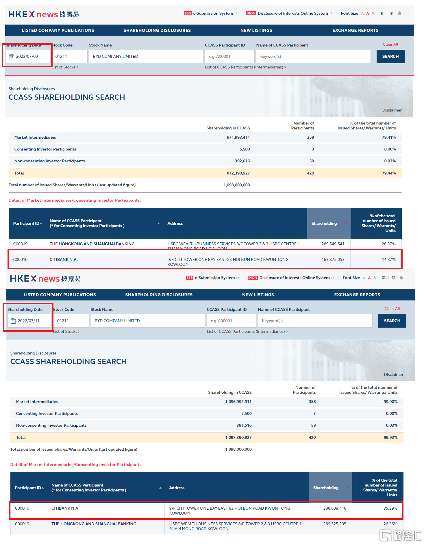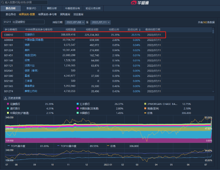 港交所CCASS数据显示,比亚迪股份(01211.HK)225,234,363股于7月11日被转让给花旗银行。市场人士从转让规模猜测,这些股份应该来自巴菲特旗下的伯克希尔·哈撒韦。
