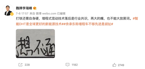 随后,长城旗下魏牌CEO李瑞峰连发六条微博,实名diss增程技术,说“做增程的闷声发大财就好了,大嘴何必说出来”。