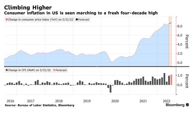 根据彭博社调查的预测中值显示,美国6月CPI预计同比增长8.8%,续创1981年以来新高。与5月份相比预计增长1.1%,这标志着过去四个月通胀将至少上涨1%。