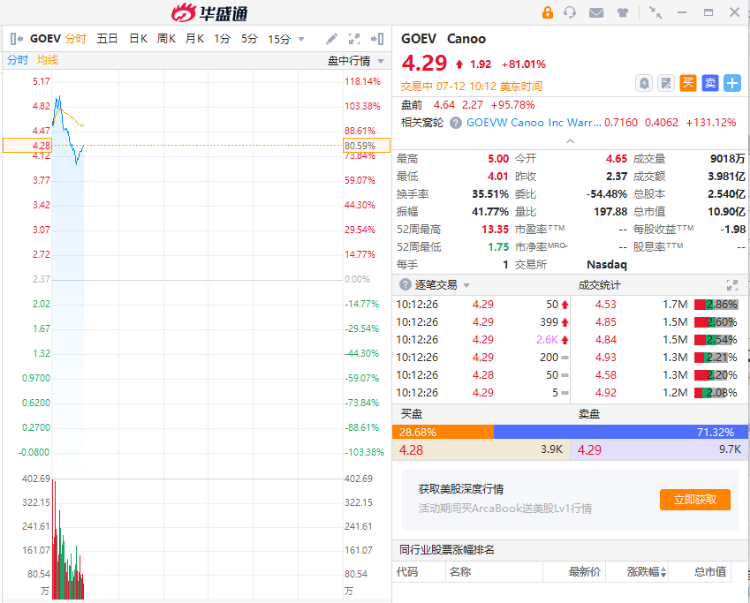 华盛资讯7月12日消息,电动车初创企业Canoo(GOEV)开盘后一度拉涨110%,截至发稿,涨幅收窄至81.01%。