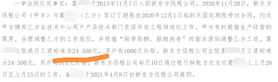 根据判决书,葛某于2013年11月7日入职新东方迅程公司,2020年11月20日,新东方迅程公司(甲方)与葛某(乙方)签订了期限自2020年12月1日起的无固定期限劳动合同,约定甲方聘用乙方在技术中心用户产品技术部门资深开发工程师岗位工作。甲方有权根据生产经营的需要,合理调整乙方的工作岗位,并根据“按劳取酬、薪随岗变”的基本原则调整乙方工资。