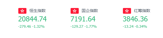 港股早盘低开低走,午后维持弱势震荡。恒生指数收跌1.32%报20844.74点,恒生科技指数跌2.14%报4524.11点,恒生国企指数跌1.77%报7191.64点。大市成交1154.91亿港元。