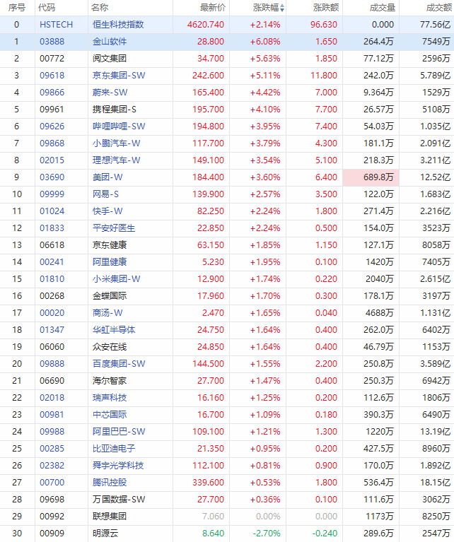 科网股全线走高,京东涨超5%,美团涨超3%,快手涨近2%,小米、百度、阿里巴巴涨超1%。