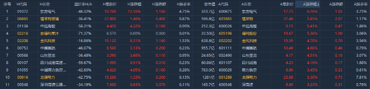 截至发稿,东方电气A股涨6.16%,H股现涨12.16%;福莱特玻璃A股涨5.85%,H股现涨1.46%;中远海能A股涨5.41%,H股现跌4.22%。