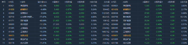 海信家电A股跌3.94%,H股跌3.72%;邮储银行A股跌3.73%,H股跌3.87%;招商银行A股跌3.56%,H股现跌5.43%。