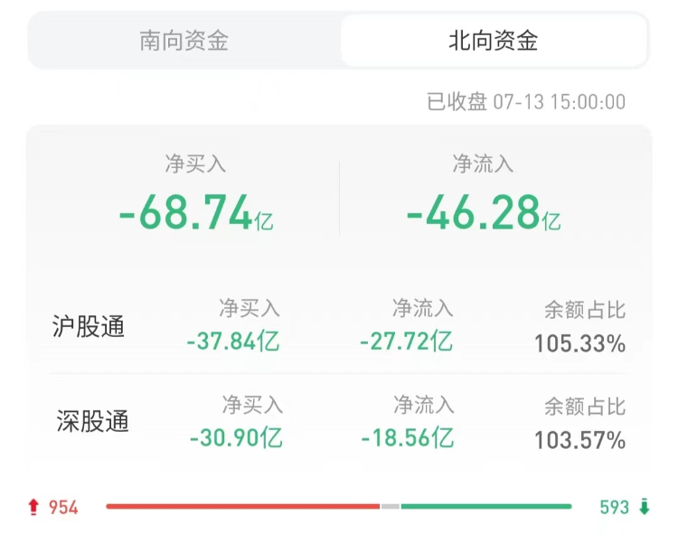 北上资金今日净卖出68.74亿元,沪股通净卖出37.84亿元,深股通净卖出30.9亿元。上一交易日净卖出42.51亿元。