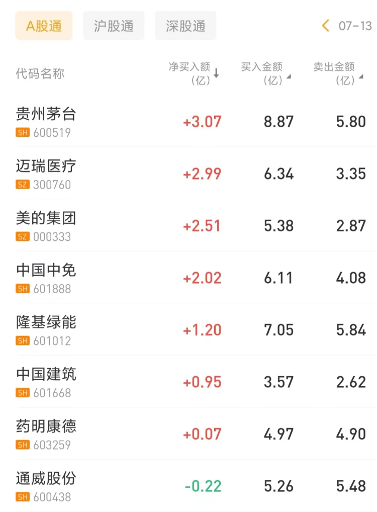 北上资金今日净买入贵州茅台3.07亿元,为今日买入之最;净买入迈瑞医疗2.99亿元。