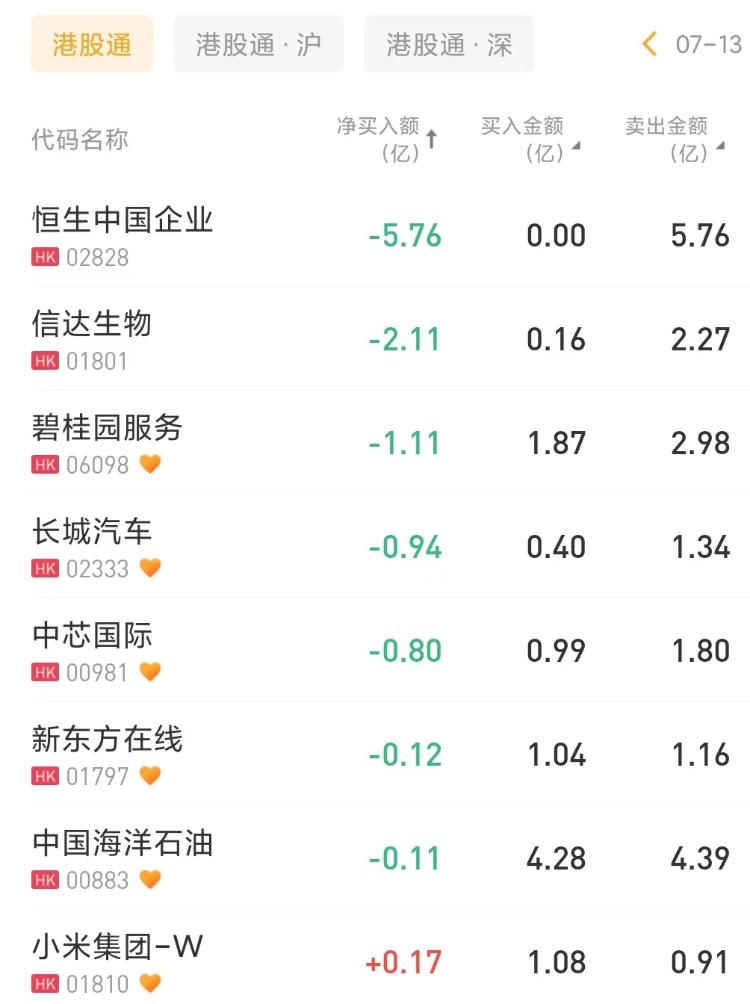 南下资金净卖出恒生中国企业5.76亿港元,为今日卖出之最,净卖出信达生物2.11亿港元。