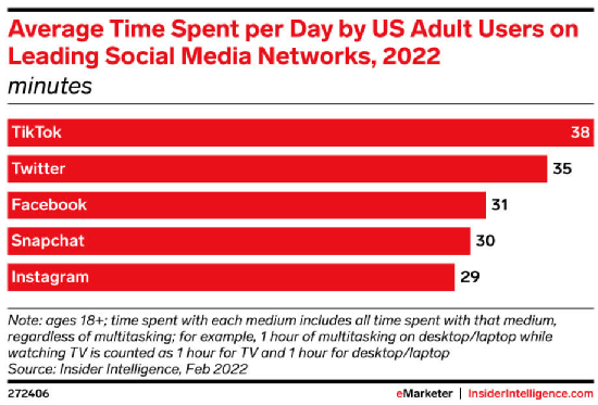 平均花费时间(ATS)仍然是关键的kpi之一,TikTok已经证明,它可以以牺牲其他社交网络为代价转移注意力。TikTok在让消费者沉迷于短视频娱乐方面做得很好,在2022年2月的一个消费者日占据了38分钟的时间。相比之下,Meta的FoA报告称,在同一时期,Facebook和Instagram的平均睡眠时间分别为31分钟和29分钟。