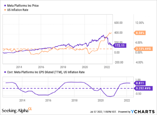 宏观:高通胀环境和即将到来的衰退会削弱电子商务和消费者支出预算。Meta的绝大部分收入来自广告,它的广告业务可能会受到更大的影响,而不仅仅是把广告业务撤出俄罗斯。尽管Meta与美国通货膨胀率周期性地高度相关,但平均关系仍然相对较弱。然而,自2012年该公司首次公开募股(IPO)以来,我们看到美国的通胀率处于历史低位,这样的比较就显得微不足道了。毫无疑问,在经济衰退期间,企业的广告支出预算会收紧,因此广告收入会减少,但收益会受到多大影响还有待观察。据《福布斯》报道,2008年的金融危机导致广告支出下降了13%,但不太可能出现类似大衰退的低迷。尽管如此,经验证据表明,市场可能已经在META中计入了经济衰退的情景。