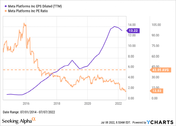 该股目前的市盈率约为13倍,明显低于该股27.9倍的五年平均水平。同样,当前8.0的价格/现金流表明,与Meta五年的平均价格/现金流18.4相比,该公司的股票已经非常便宜。因此,过去五年,Meta的市盈率处于历史低位,而收益却一直在增长。在目前的水平上,该股提供了一个有吸引力的估值,同时提供了一个合理的安全边际。