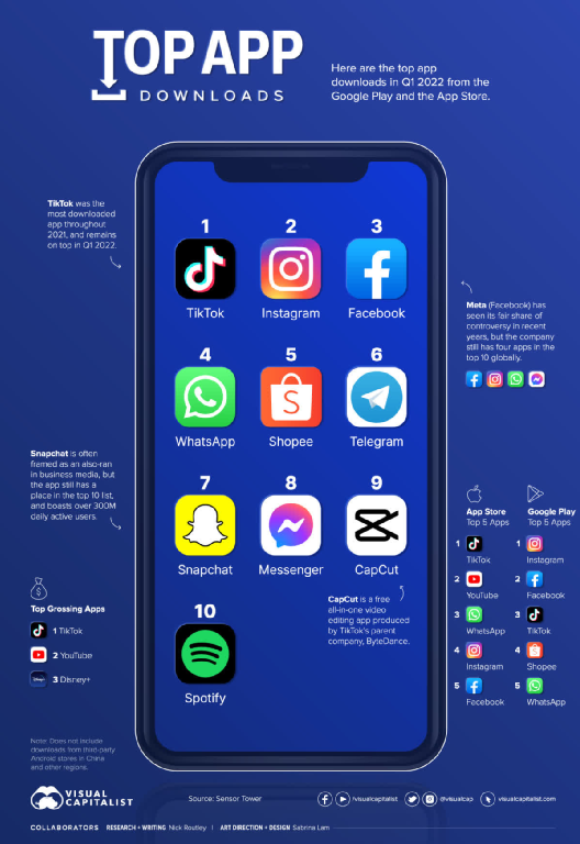 自2019年以来,TikTok通过短视频战略重塑了整个格局,成为了一个游戏规则改变者。不出所料,这一新趋势引起了人们的注意,并将YouTube推向了Shorts,将Meta推向了Reels。毫无疑问,TikTok报告了更高的增长,并在2021-2022年下载量最高的应用程序中排名第一。然而,Meta的Family Of Apps (FoA)仍然排在前五名,尤其是在谷歌Play, Instagram和Facebook分别排在第一和第二名。