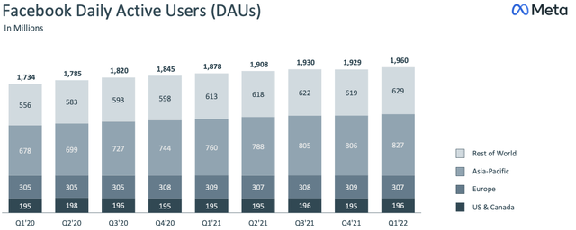 尽管欧洲市场的DAU和mau分别减少了200万和900万,但该季度的用户净增数量仍有所增长。该地区的负增长主要是由于俄罗斯政府在3月初封锁了该平台。然而,由于该国对Facebook的限制是在2022年第一季度的下半年出台的,屏蔽的全面影响并没有反映在2022年第一季度的数据中。公司管理层预计,这一影响将在2022年第二季度更加明显,导致全球MAU连续持平。