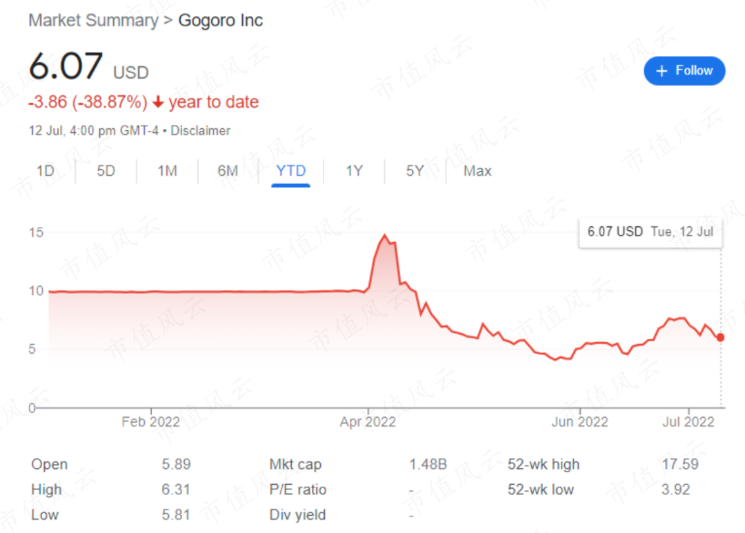 2022年4月6日,Gogoro以SPAC合并的方式在纳斯达克挂牌。上市首日,公司收盘价14.0美元,市值超过34亿美元。