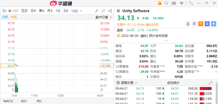华盛资讯7月13日消息,受盘前CPI数据影响,美股开盘后三大指数跳水,明星股悉数下跌。截至发稿,Unity Software下跌14%,英伟达跌约3%,谷歌A跌1.7%,奈飞跌1.5%,苹果跌1.22%,赛富时跌1.2%,亚马逊跌1%,特斯拉跌0.8%。