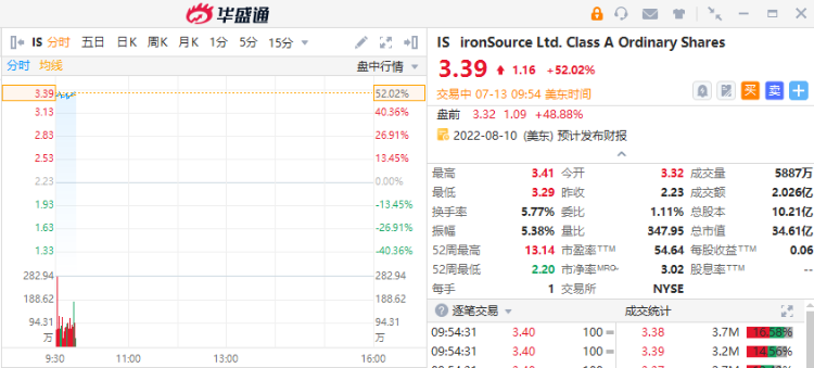 受合并消息刺激,ironSource $IS 涨52.02%。ironSource表示,与Unity Software合并交易完成后,公司CEO Tomer Bar-zeev将加入Unity的董事会,公司位于以色列的总部将作为Unity的另一个全球中心。预计到2024年底,合并后公司的调整后EBITDA将达10亿美元。
