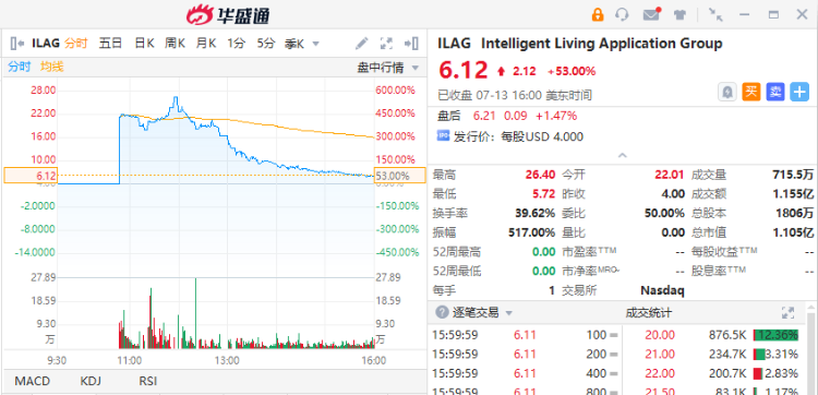 中国机械锁制造商Intelligent Living Application Group(ILAG)上市首日收涨53%,开盘之初暴涨450%,开盘价为22.01美元,IPO定价为每股4美元,首次公开发行506万股普通股。Network 1 Financial Securities担任本次发行的唯一账簿管理人。