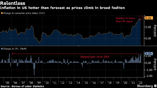 在数据显示美国6月CPI同比上升9.1%,创1981年底以来最大涨幅后,投资者提高了对本月加息100基点的押注。
