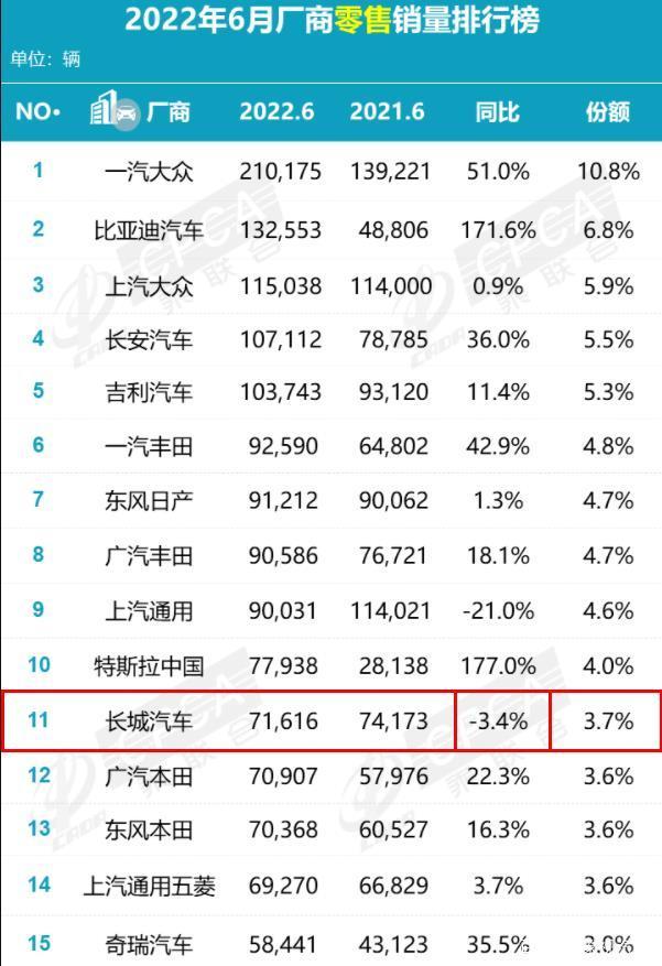 散发的疫情,在6月份得到较好抑制,随着供应链改善,以及促消费政策的出台,汽车市场有所复苏,各大车企纷纷报喜。可惜对于长城汽车来说,热闹却是别人的,自己什么也没有。乘联会数据显示,长城6月份零售销量只有71616辆,被挤出车企销量十强榜。从整体销量来看,比亚迪、吉利、长安月销均超十万辆,长城被远远甩开了;从增长幅度来看,15强榜单上,只有长城和上汽通用销量同比下跌,其他车企均实现正增长。