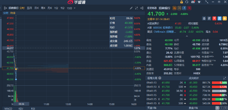 华盛资讯7月14日讯,港股内地银行股持续下挫,招商银行一度跌超8%,邮储银行跌近5%,农业银行跌近3%。