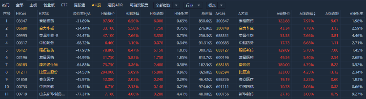 截至发稿,金力永磁A股涨7.78%,H股现涨5.58%;泰格医药A股涨7.97%,H股现涨6.56%;荣昌生物A股涨7.66%,H股现涨7.66%。