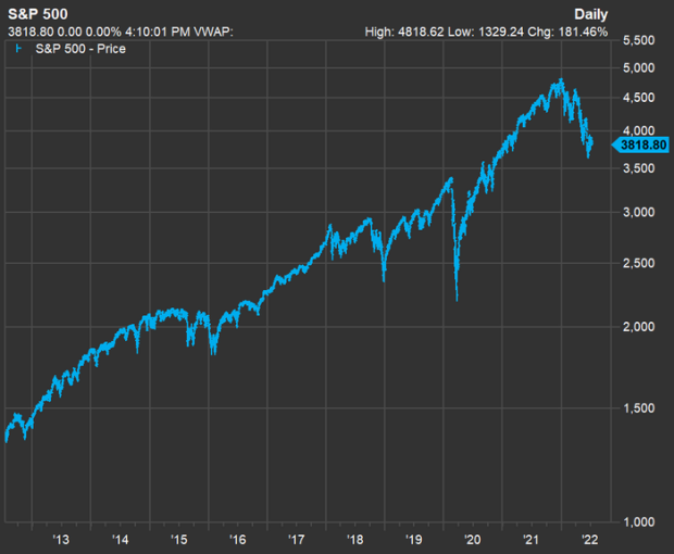 表格中的数据有些难以置信,过去10年中只有两年熊市,而且熊市并没有看上去的那么糟糕。但这张标普500指数的10年价格图表显示:股市的大幅回调非常频繁。