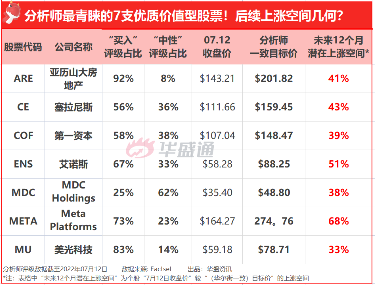 以下是FactSet调查分析师对这7支股票的观点总结。除了MDC,大多股票评级均为“买入”或类似评级。分析师认为这七支股票在未来12个月存在巨大的上涨空间,Meta或反弹近70%,艾诺斯反弹或超五成。