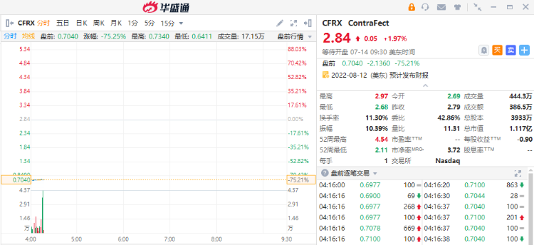 华盛资讯7月14日消息,美股盘前,ContraFect重挫75%,该公司称,DSMB建议停止突破性疗法重组裂解酶(Exebacase)的第三阶段临床试验。