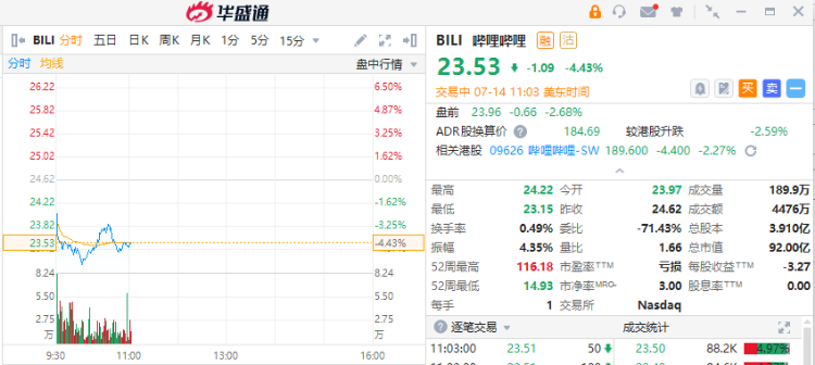 华盛资讯7月14日消息,周四美股三大指数纷纷下跌,道指、标普500跌超1.8%,纳指跌超1.5%。热门中概股普跌,截至发稿,哔哩哔哩跌4.43%,贝壳跌3.9%,微博跌3.4%,阿里巴巴、拼多多、百度、携程网跌超2%,网易、京东、唯品会跌超1%。