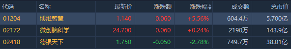 介入医械商微创脑科学$02172.HK 高开0.24%,盘前成交额2190万港元,昨日暗盘微跌0.37%;商用车服务商德银天下 $02418.HK 低开2.78%,昨日暗盘收跌5.00%。