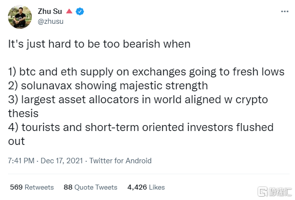 2018年12月21日,一个名叫Zhu Su的新加坡籍华人发布了一条极富争议性的推文——“我们将很快冲出(加密)熊市,让其他传统投资者困在法定货币之中[2]。”