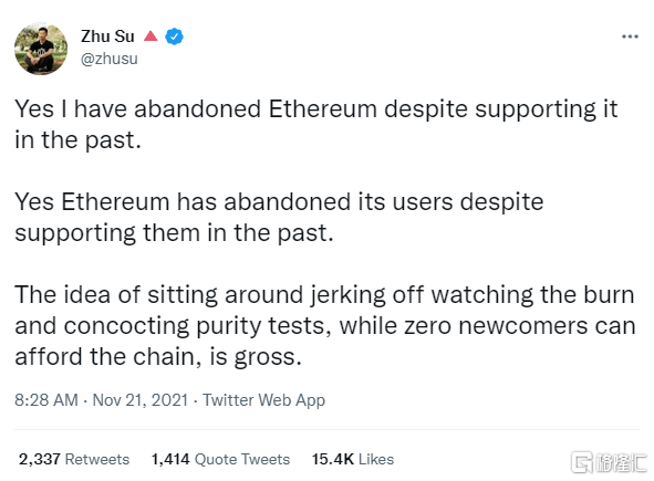 Zhu Su还曾亲自下场做空市场。2021年11月,他发推声称以太坊创始人“已经忘记了他们最初的理想”,大力抨击以太坊昂贵的手续费。半个月后,他们被发现早已偷偷趁人之危购入了约10万枚以太币。