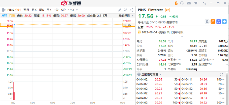 华盛资讯7月15日消息,美股盘前,Pinterest涨逾15%,传激进对冲基金Elliott持股超9%。