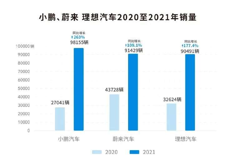 在长江证券发布的调研报告中显示:2021年,头部新势力“蔚小理”的全年销量,均突破了9万辆;而在2020年“蔚小理”三家的全年销量,分别只有43728、27041、32624辆。其中,小鹏汽车同比增长最快,高达263%。