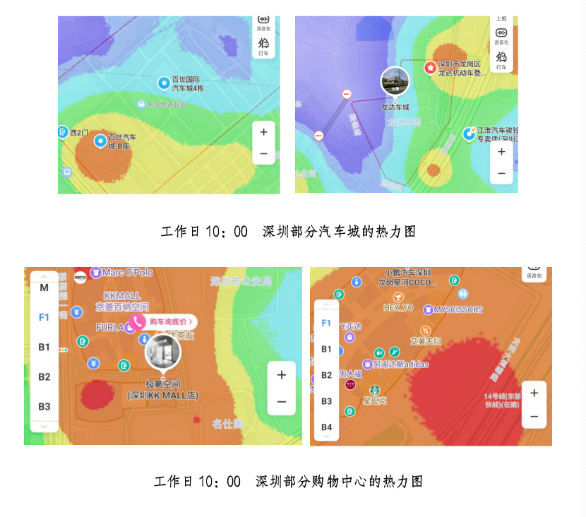 打开地图APP的热力图,懂懂笔记发现,工作日的上午10点,深圳市内主流的汽车城客流量均有限,而部分进驻了新能源汽车品牌的综合体、购物中心,客流量明显高一些,且分布更集中。