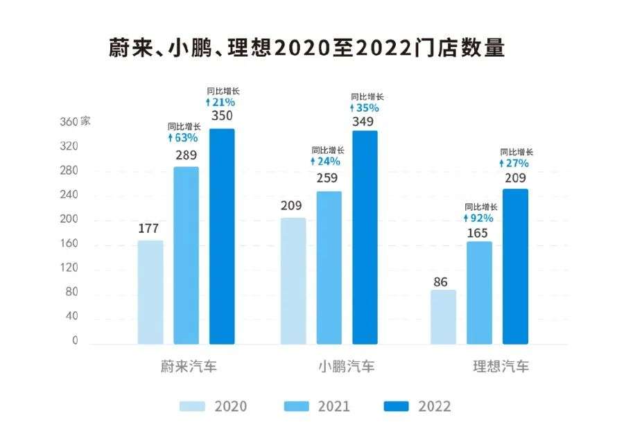 再看“蔚小理”的门店规模,2020年分别只有177、209、86家;到了2021年,三家品牌的门店规模分别达到了289、259、165家;2022年,更是达到了350、349、209家之多。