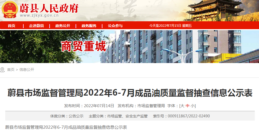 中国质量新闻网讯 近日,河北省蔚县市场监督管理局发布2022年6-7月成品油质量监督抽查信息公示表。