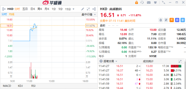 华盛资讯7月15日消息,数字金融服务平台尚城数科今日登录纽交所,首挂高开高走,截至发稿,涨幅扩大至111.67%,报16.51美元。