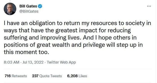 在宣布捐款 200 亿美元的同时,盖茨连发了 3 篇推文,提到过去几年有几次巨大的全球性挫折,让许多人感到灰心,甚至怀疑世界是否会变得更糟。