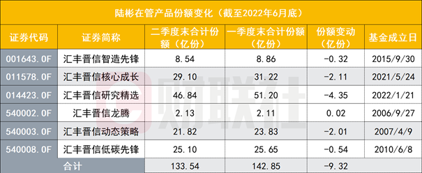 此外,汇丰晋信动态策略、汇丰晋信核心成长这2只产品二季度净赎回份额超2亿份,截至期末,这2只产品的基金份额分别为21.82亿份、29.10亿份。汇丰晋信低碳先锋、汇丰晋信智造先锋分别在二季度净赎回5434.47万份、3165.06万份。整体来看,除了新成立的汇丰晋信时代先锋,陆彬在管的6只产品在二季度合计净赎回9.32亿份。