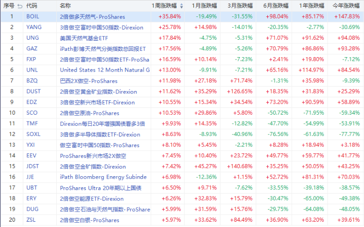 本周ETF排行榜中,天然气成为涨幅最高的交易品种,其次是做空富时中国50指数、黄金、原油的ETF,在做多股票类ETF中,仅有3倍做多半导体指数ETF涨幅超过8%。