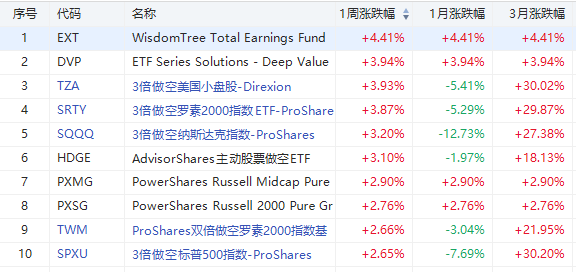 本周股指ETF涨幅榜中均为做空类ETF,其中3倍做空小盘股的TZA涨幅最高,一周涨近4%,其次是3倍做空纳指的SQQQ,一周涨超3%。